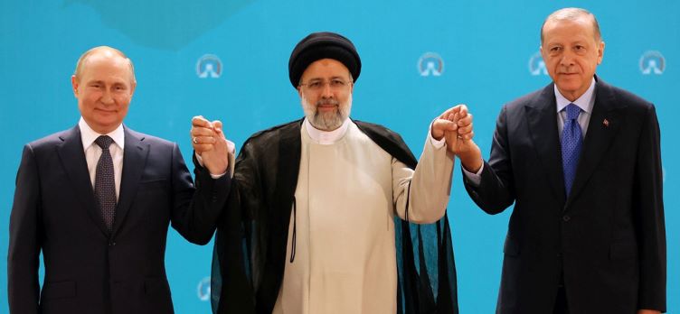 Les présidents russe Vladimir Poutine, iranien Ebrahim Raissi et turc Recep Tayyip Erdogan lors du sommet de Téhéran le 19 juillet 2022.En outre, le ministre russe des Affaires étrangères Sergueï Lavrov s’était montré très compréhensif lors de sa visite à Ankara le 8 juin. "Nous comprenons parfaitement les préoccupations de nos amis concernant les menaces créées à leurs frontières par des forces extérieures qui alimentent le sentiment séparatiste dans les territoires contrôlés par les unités américaines qui y séjournent illégalement" avait-il affirmé. De son côté, le chef de la diplomatie iranienne, Hossein Amir-Abdollahian, avait dit « comprendre » les inquiétudes turques lors d’un déplacement en Syrie le 2 juillet, soulignant toutefois que « toute action militaire turque dans le nord de la Syrie serait un élément déstabilisateur dans la région ».