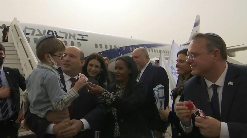 L'ancien Premier ministre Naftali Bennett accueille des juifs fuyant l'Ukraine à leur arrivée en Israël (AFP)