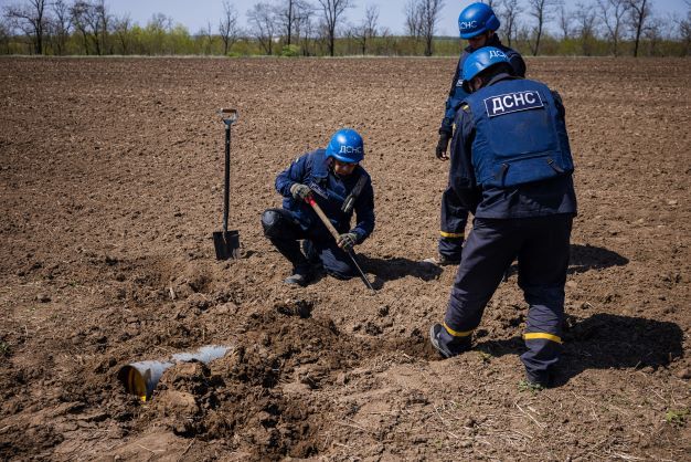 Des démineurs ukrainiens dans un champ de bléDes porte-conteneurs des grands armateurs européens pourraient aussi être mis à contribution pour prendre en charge des produits déjà transformés en Ukraine, comme de la farine ou des pâtes, indique-t-on dans la profession. Les navires devront être inspectés à Istanbul avant d'aller en Ukraine par des représentants des quatre parties, pour garantir qu'ils ne transporteront pas d'armes.