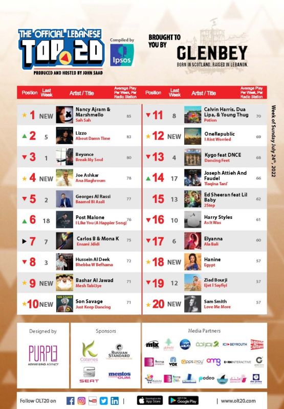 Toutes nos félicitations à la chanteuse libanaise Nancy Ajram et au producteur musical et DJ américain connu sous le nom de Marshmello qui, ensemble, décrochent la plus forte nouvelle entrée de la semaine avec Sah Sah. Cette chanson est le dixième numéro un dans OLT20 de Nancy Ajram et le tout premier de Marshmello. Sortie il y a juste trois semaines sur toutes les plateformes digitales et radios libanaises et régionales, Sah Sah vient d’atteindre les 25 millions de vues sur YouTube. Elle est aussi numéro un dans la plupart des pays du Golfe et de l’Afrique du Nord (région MENA). La chanson vient aussi d’être nommée Chanson du mois sur la chaîne sportive Américaine ESPN et elle est aussi devenue la première et seule chanson arabe de l’histoire à atteindre le Top 10 iTunes mondial!