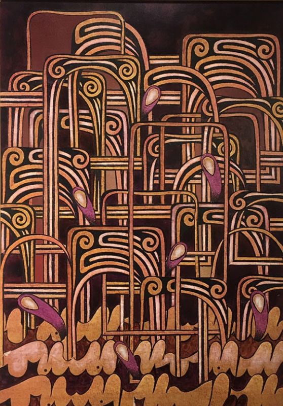 C’est donc tout un univers mental, quelque chose entre onirisme et fantasmagorie, qui se décline sur les cimaises de la galerie: fantasmes, exotismes et utopies urbaines, architectures oniriques, paysages dans les paysages, images dans les images, visages qui contemplent et imagos sexuels, avec un goût pour la ligne, les entrelacs et les courbes, la composition géométrique mais aussi sa décomposition, celle des lignes, et des formes.