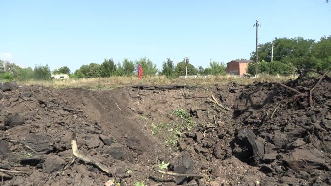 Un énorme cratère creusé par un missile russe à Soledar, dans le Donbass.