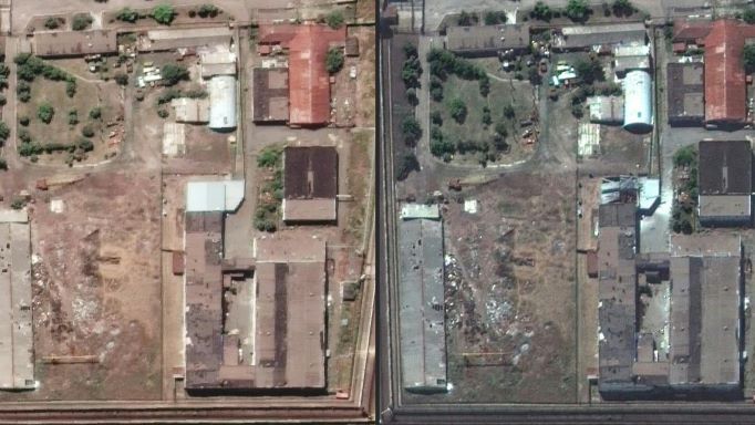 Deux images satellitaires de la prison d'Olenivka, avant et après les explosions qui ont tué des prisonniers de guerre ukrainiens.