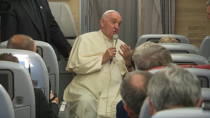 François s'adressant aux passagers du vol papal en route vers Rome.