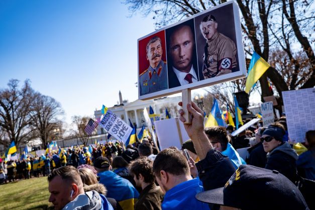 Dans presque toutes les manifestations de par le monde, le régime de Poutine est assimilé à ceux d'autres dictateurs à cause du peu de respect qu'il accorde pour les droits des civils.