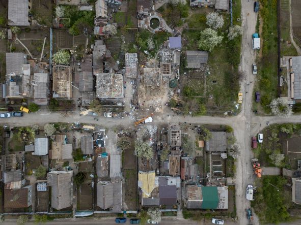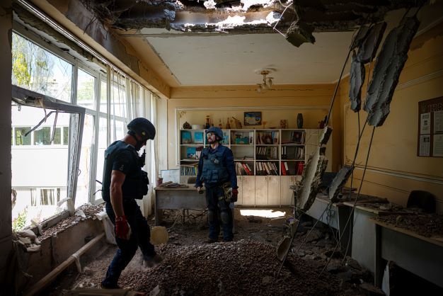 L'établissement, accueillant en temps de paix quelque 500 enfants de 6 à 17 ans, est la deuxième école de la ville, réduite en poussière, et sept autres ont été endommagées depuis le début de la guerre, selon Denis Syssoïev, responsable du département éducation à la mairie. L'école était utilisée depuis le début de la guerre comme dépôt d'aide alimentaire.