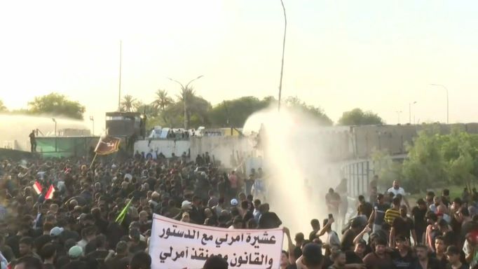 La police de Bagdad utilise des canons d'eau pour empêcher les manifestants de pénétrer dans la zone verte.
