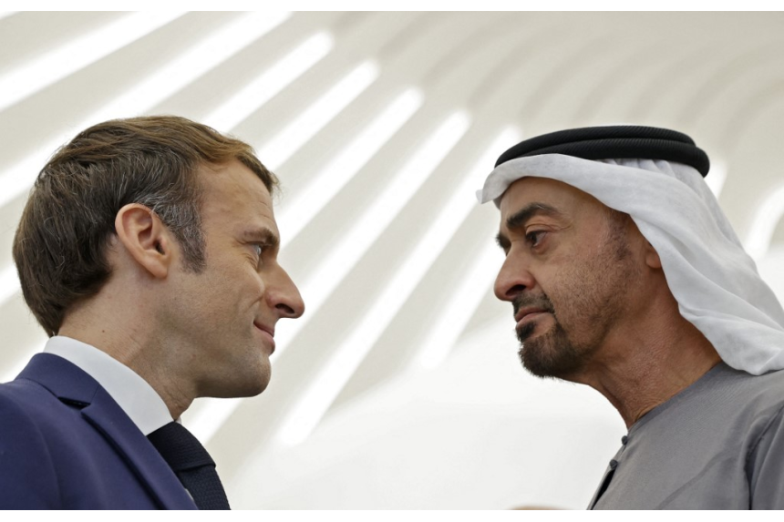 © Emmanuel Macron et le prince héritier d'Abou Dhabi Mohammed ben Zayed al-Nahyane lors de leur rencontre à Dubaï. (AFP)