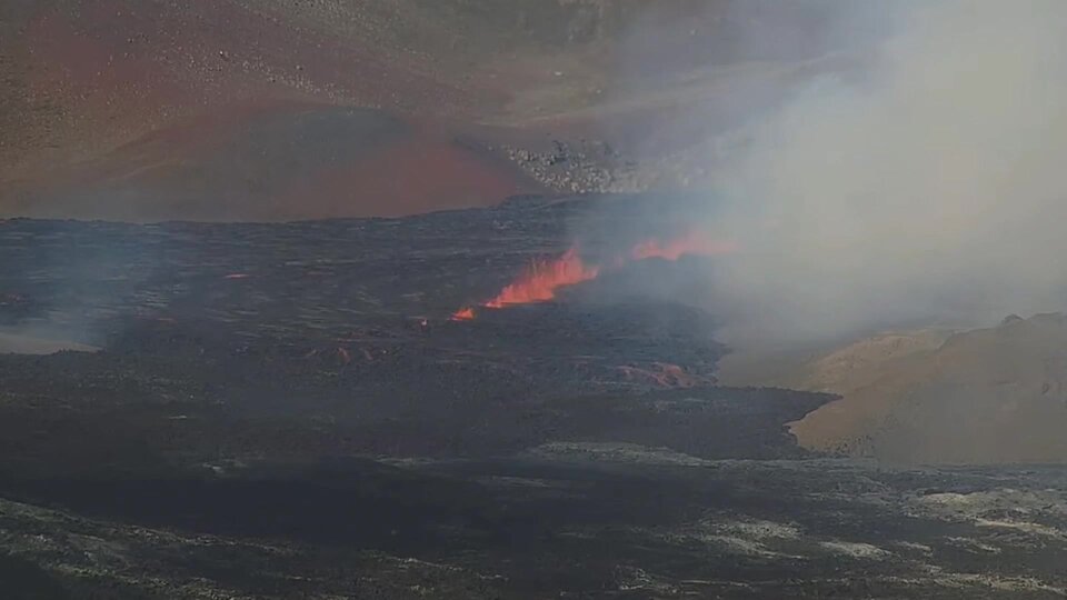 L'éruption, située à environ 40 kilomètres de Reykjavik, laisse apparaître des jets de lave en fusion se transformant en roche sombre à mesure que la matière refroidit et laissant s'échapper une fumée bleutée.