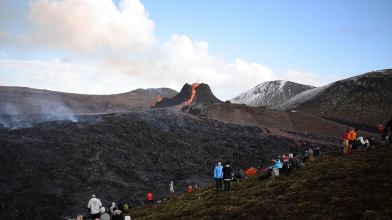 Des touristes lors de l'éruption de 2021 (AFP)L'éruption, qui avait vu plus de 140 millions de mètres cubes de magma se déverser sur une période de six mois, avait attiré plus de 430.000 visiteurs selon l'Office du tourisme islandais.