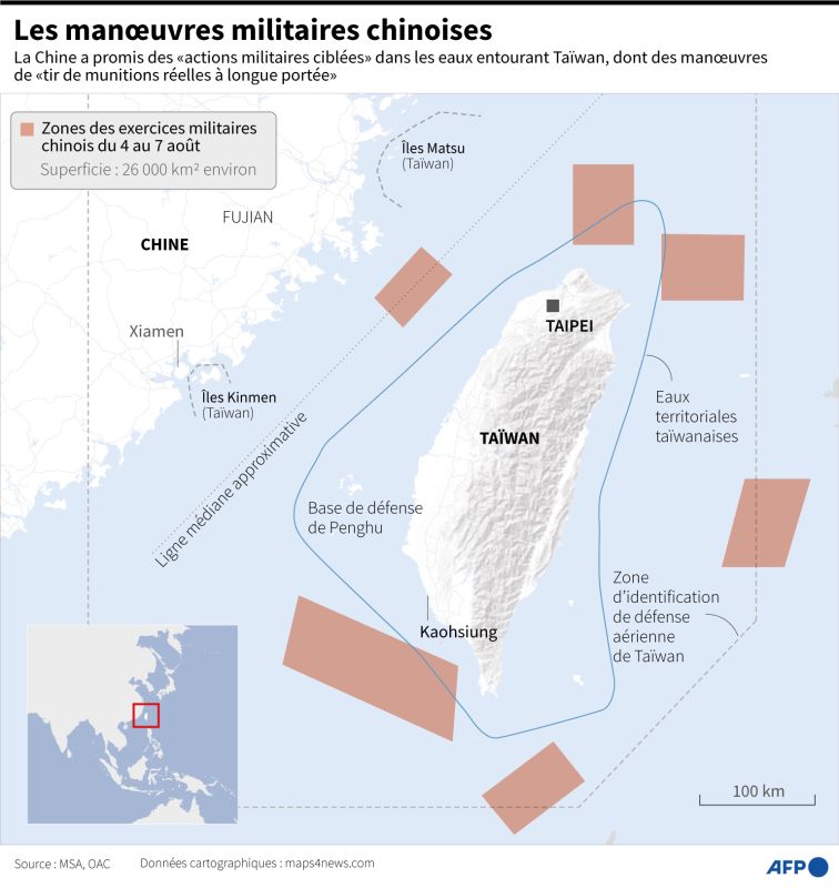 Après plusieurs jours sous haute tension, la Chine clôturait dimanche ses plus grands exercices militaires jamais menés autour de Taïwan. Ces exercices sont la conséquence de la visite de la présidente de la chambre des Représentants américaine Nancy Pelosi à Taïwan, qui avait provoqué l'ire des dirigeants chinois. Dimanche, la Chine a effectué des "exercices pratiques conjoints en mer et dans l'espace aérien" autour de Taïwan. Elle compte en outre mener de nouveaux exercices "à tir réel" jusqu'au 15 août dans la mer Jaune qui sépare la Chine de la péninsule coréenne.
