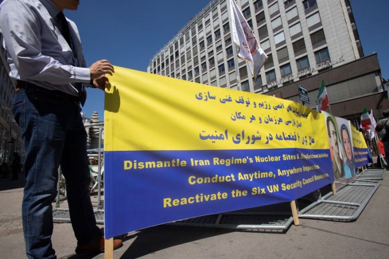 Des membres du groupe d'opposition iranien CNRI (Conseil national de la résistance iranienne) protestent contre le régime iranien à proximité du Palais de Cobourg, le 4 août 2022. (AFP)"Cela n'a rien à voir avec le JCPOA. En même temps, l'Iran dit que c'est fondamental. J'espère que l'Iran et l'AIEA auront un accord parce que cela facilitera beaucoup de choses", a déclaré le responsable européen.