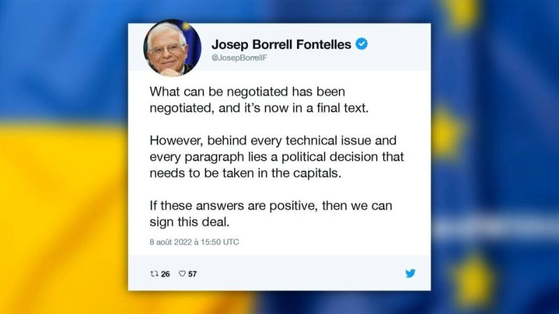Alors que les grandes puissances attendent une réponse de l'Iran pour sauver l'accord sur le nucléaire, l'agence officielle Irna a indiqué ce vendredi que l'Iran est prêt à accepter à condition que le texte soit assorti d'un certain nombre d'assurances. "Les propositions de l'Union européenne sont acceptables à condition qu'elles fournissent des assurances à l'Iran sur divers points" a déclaré un diplomate iranien à l'agence. Le chef de la diplomatie européenne Josep Borrell avait soumis une nouvelle proposition d'accord à Téhéran le 26 juillet.