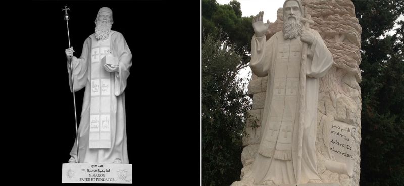 À gauche : Statue de Saint-Maron au Vatican avec inscription serto. À droite : Statue de Saint-Maron à Bkerké avec inscription estranguélo.