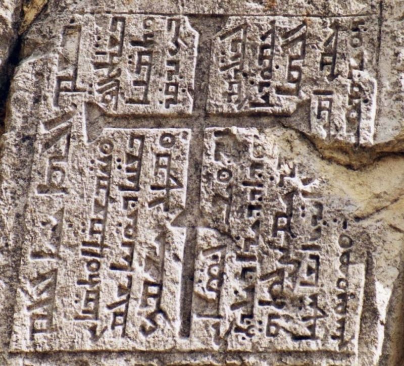 La première des trois graphies syriaques est l’estranguélo employé pour les monuments, les titres et les croix qui ornent les manuscrits aussi bien du Liban que de Syrie-Mésopotamie. Nous l’apercevons ici à la ligne 2, juste sous l’original phénicien. À la ligne 3, la graphie madenhaya signifiant orientale, est appelée aussi assyro-chaldéenne ou encore nestorienne. Enfin, la dernière forme, à la ligne 4, est la cursive occidentale appelée serto.