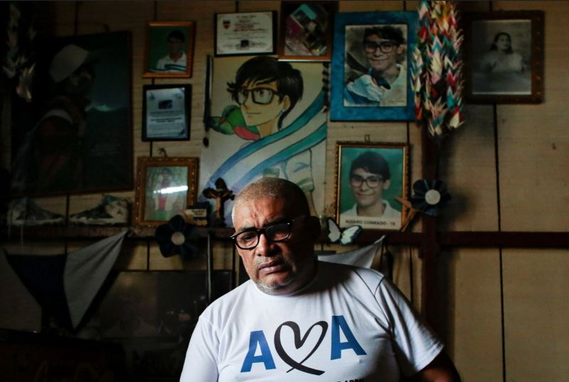 Le père d'une des victimes des manifestations de 2018, vêtu d'un tee-shirt d'une organisation de charité catholique.