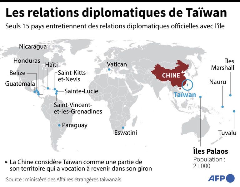 Carte publiée en 2021, avant que le Nicaragua ne rompe ses relations avec Taïwan (AFP)Refuge du gouvernement nationaliste chinois depuis 1949, l’île de Taïwan a tout d’abord bénéficié d’une importante reconnaissance internationale, puisqu'elle était considérée comme le siège du gouvernement chinois légitime, face à la Chine continentale gouvernée par les communistes. En effet, suite à la défaite du Kuomintang face aux communistes chinois, le parti du président déchu Tchang Kaï-chek de la République de Chine s’établit à Taïwan. Chacun des deux États estiment alors être le seul représentant de la « vrai » Chine. Cependant, dès 1950, le Royaume-Uni change de position et reconnait diplomatiquement la République populaire comme représentante légitime de la Chine. Il sera suivi par le Canada en 1970.