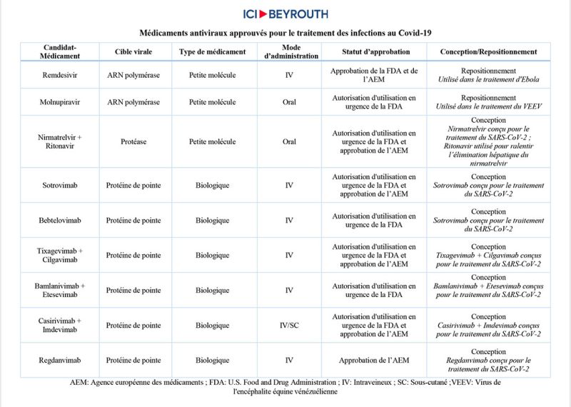 Outre la réaffectation des médicaments, de nouvelles molécules, notamment un certain nombre d’anticorps monoclonaux neutralisants ciblant la protéine de pointe virale S et un inhibiteur spécifique de protéase, ont également été découvertes, développées et approuvées par les autorités chargées de la réglementation des médicaments aux États-Unis, en Europe ou ailleurs, en tant que traitements anti-Covid-19. Cette partie fera l’objet d’un article distinct sur Ici Beyrouth.