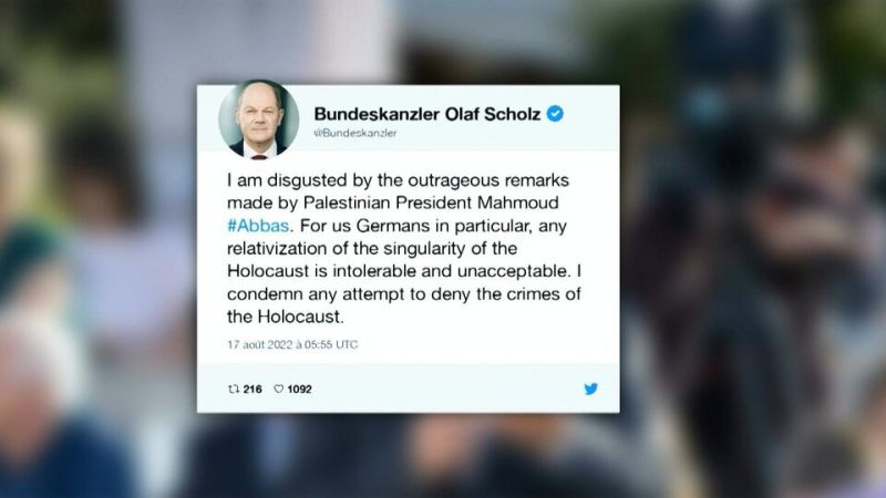 Lors d'une conférence de presse à Berlin en Allemagne, le président palestinien Mahmoud Abbas a comparé la politique israélienne envers les Palestiniens et la Shoah perpétuée par l'Allemagne nazie. Des propos qui ont fait vivement réagir Israël et l'Allemagne. Le chancelier allemand Scholz s'est dit "dégoûté" par les propos du président Abbas.