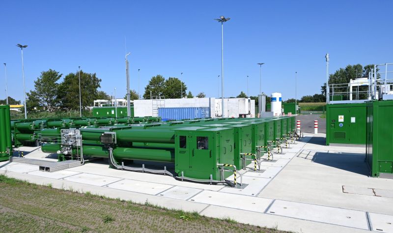 Une station de remplissage d'hydrogène destinée à un train fonctionnant entièrement à l’hydrogène. Bremervoerde, le 24 août 2022. (CARMEN JASPERSEN /AFP)
