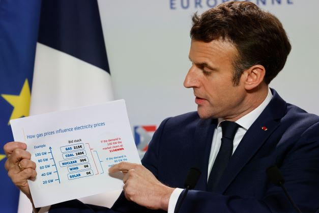 Emmanuel Macron montre un schéma sur la façon dont les prix du gaz influencent les prix de l'électricité pendant qu'il s'adresse à la presse lors d'un sommet de l'Union européenne en mars dernier. (Photo de Ludovic MARIN /AFP)Le président français Emmanuel Macron a souligné, mercredi, la gravité des enjeux de la rentrée. Il a notamment appelé le gouvernement et la majorité à «l'unité» pour faire face à «la grande bascule» liée aux effets de la crise climatique et à «la fin de l'abondance».