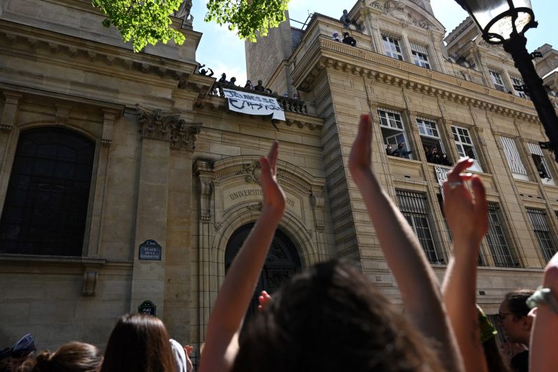 Plusieurs centaines d'étudiants se sont mobilisés le 14 avril 2022 à Paris et Nancy, bloquant les bâtiments universitaires pour faire entendre leur voix entre les deux tours de l'élection présidentielle et sensibiliser aux enjeux écologiques et sociaux. (Photo: Emmanuel Dunant / AFP)«L'unité nécessite la contribution à juste proportion des ressources de chacun. Pourquoi dès lors refuser d'augmenter les salaires, de mettre fin à la gabegie financière et écologique des ultra-riches et de taxer enfin les superprofits des multinationales ?», a critiqué de son côté le député LFI Manuel Bompard.