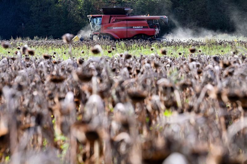 Une moissonneuse travaille dans un champ de tournesols fanés en raison de la sécheresse dans la région Rhône-Alpes (sud-est de la France). Le 24 août 2022. (Olivier Chassignole / AFP)«Après la saison que nous venons de vivre», «nous aurons des choix clairs et forts à prendre", a averti M. Macron.