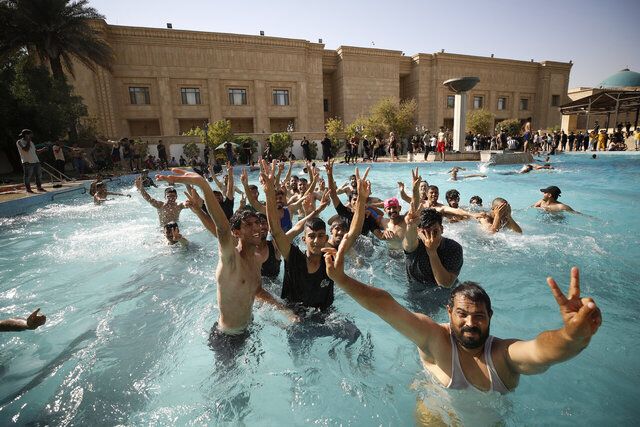 Certains manifestants se sont baignés dans un bassin dans le jardin du palais de la République (AFP)