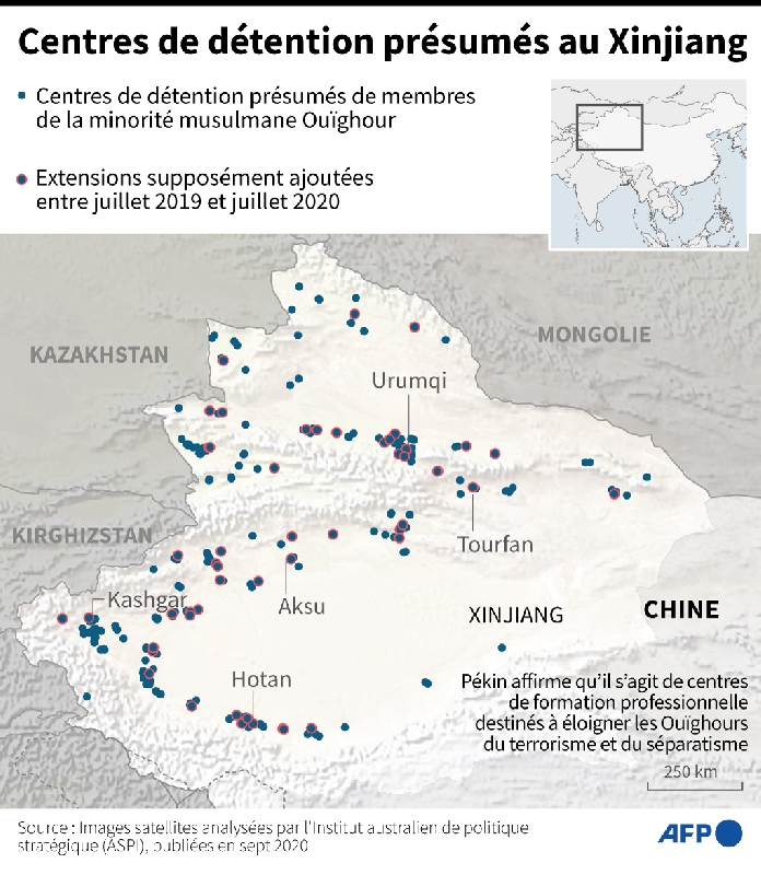 Des études occidentales, fondées sur des interprétations de documents officiels, des témoignages de victimes présumées et des extrapolations statistiques, accusent Pékin d'avoir interné dans des "camps" au moins un million de personnes, majoritairement ouïghoures, d'effectuer des stérilisations et avortements "forcés", ou encore d'imposer du "travail forcé".