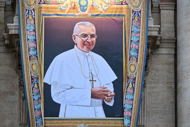 Une tenture murale représentant le pape Jean-Paul I est exposée sur la façade de la basilique Saint-Pierre lors de la messe le déclarant bienheureux, présidée par le pape François au Vatican. (AFP)Bienheureux