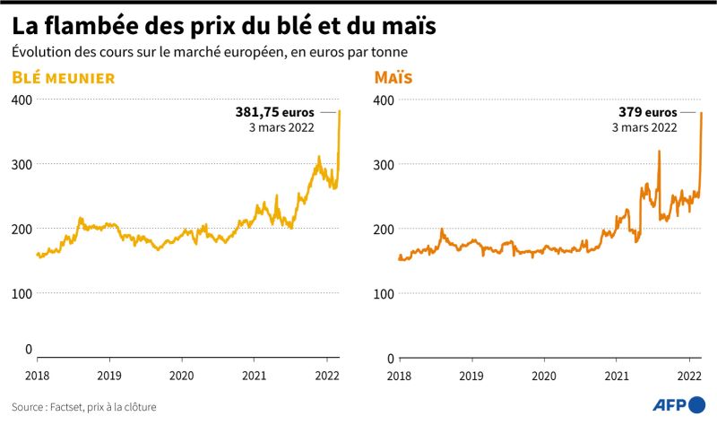 Sur Euronext, la tonne de blé s'échangeait mercredi après-midi à 331,25 euros pour une livraison en décembre (+12,5 euros depuis la veille). Le maïs était au même prix, pour livraison en novembre (+10,5 euros).