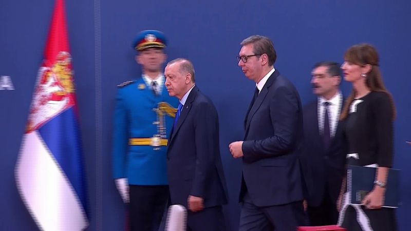 Le président turc Recep Tayyip Erdogan, lors d'une conférence de presse avec son homologue serbe Aleksandar Vucic, à Belgrade.
