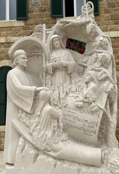 Sculpture comportant «Philokalia», inscrit en lettres syriaques dans un vitrail, et l’hymne maronite «Glorifiez le Seigneur», gravé dans la pierre. © Amine Jules Iskandar