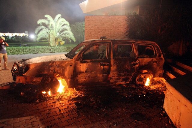 Voiture en flamme au sein du consulat américain lors de l'attaque de Benghazi (AFP)Les assaillants tirent ensuite au mortier sur un bâtiment utilisé par l'agence de renseignement CIA dans un autre quartier de Benghazi, tuant deux anciens membres des Navy Seals, une force d'élite.
