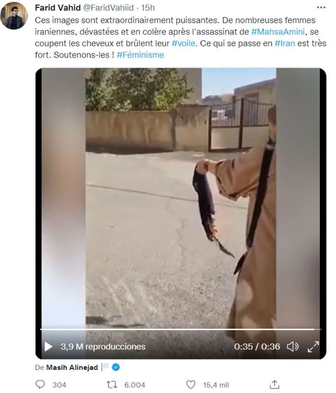 Sur son compte Twitter, le chercheur Farid Vahid a partagé une vidéo dans laquelle plusieurs femmes iraniennes se coupent les cheveux ou brûlent leur voile en réaction à la mort de Mahsa Amini."Vêtements décents"