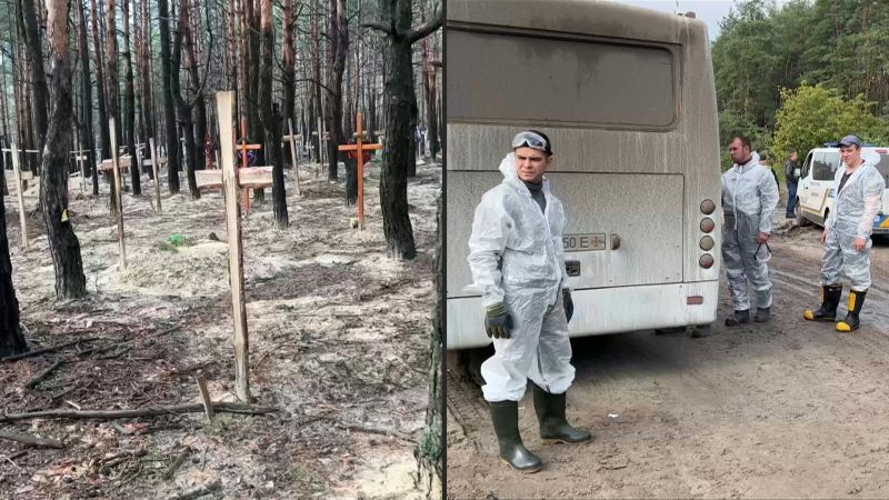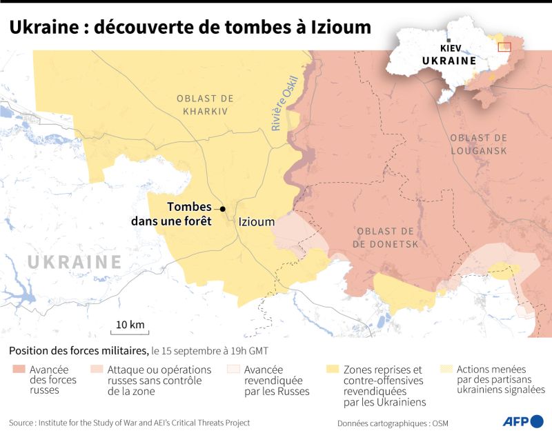Selon les autorités ukrainiennes, plus de 440 tombes ont été retrouvées dans cette forêt près d'Izioum, où la police nationale a aussi dit avoir découvert, comme dans d'autres localités reprises récemment, des "salles de torture".