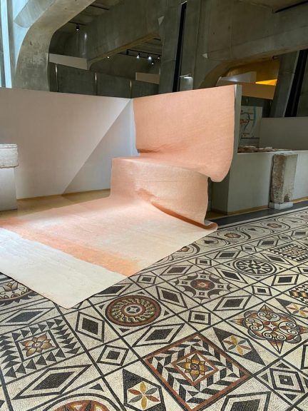 Avec ces fresques disposées dans plusieurs lieux de la Biennale, Chafa Ghaddar montre sa maîtrise des matériaux naturels et traditionnels. Plier ses toiles, les disposer autour de monuments antiques ou les placer tels des étendards interpelle sur les relations entre les divers médiums et les façons de les appréhender, et révèle une exploration de l’artiste dans les espaces et sa façon toute personnelle de s’en imprégner.