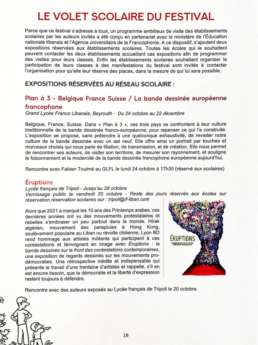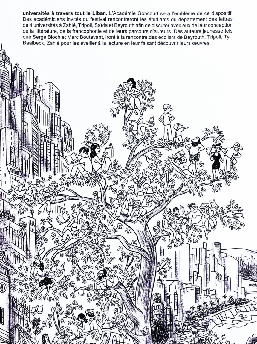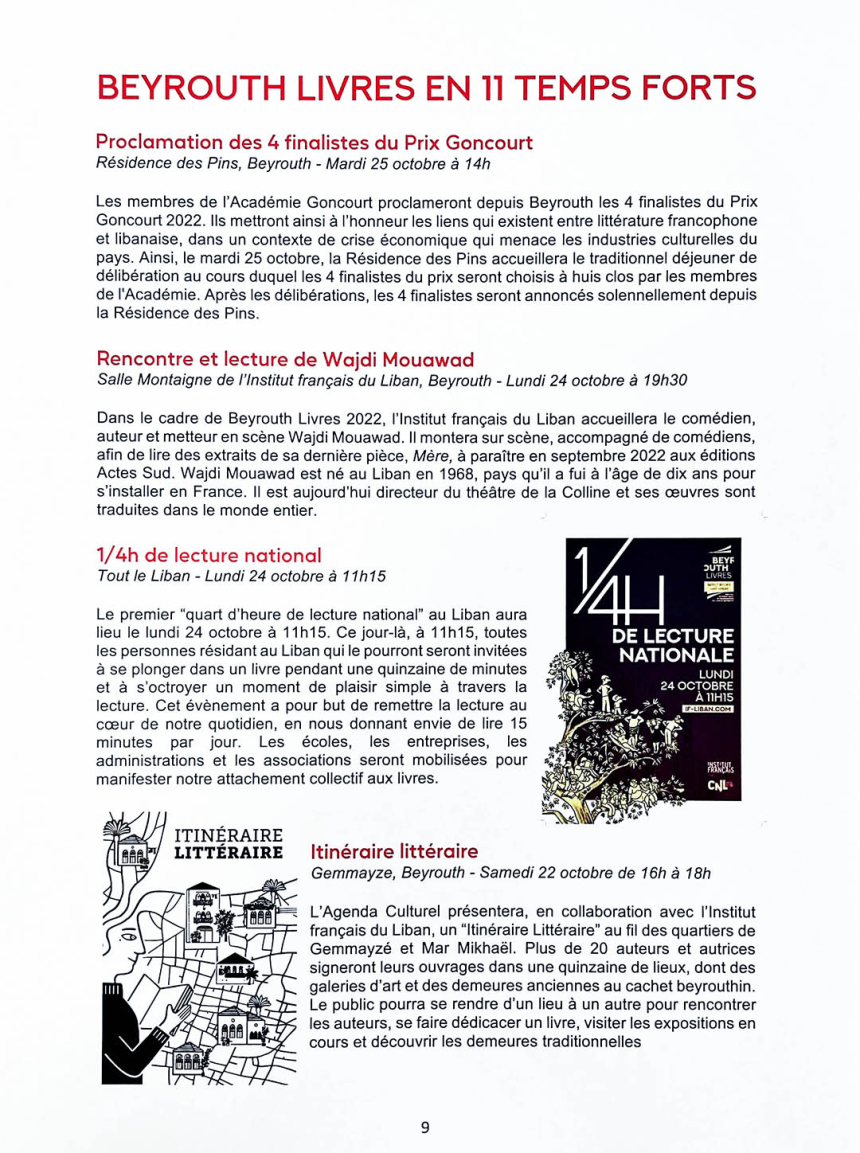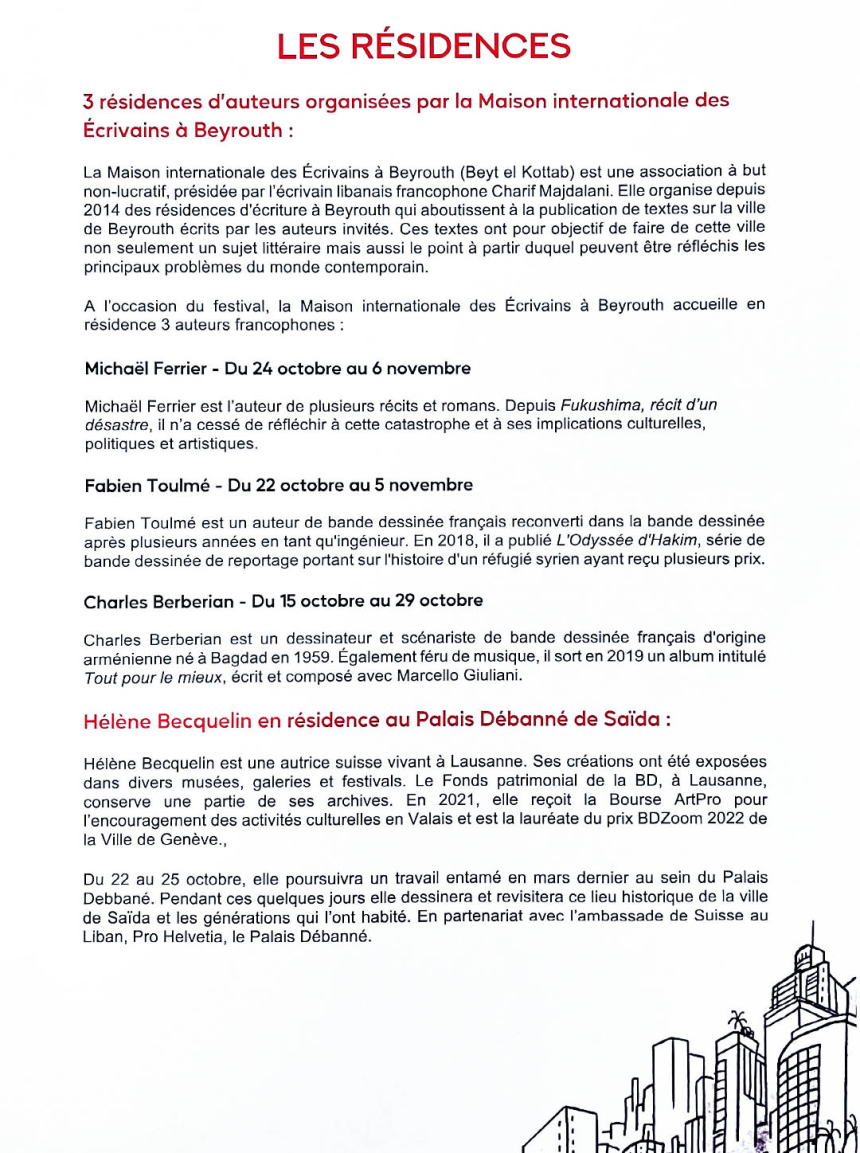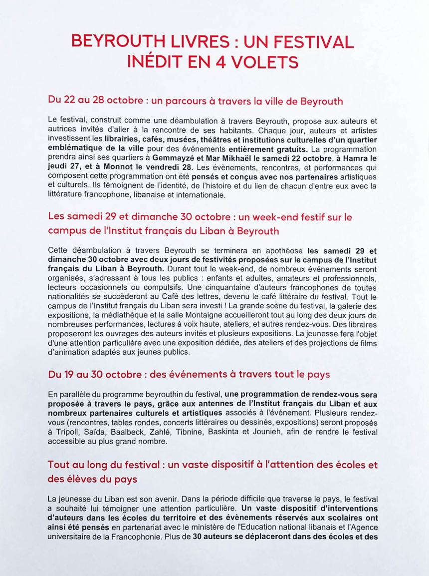 En parallèle, des événements seront organisés dans de nombreuses villes libanaises. Les lieux culturels de Tripoli, Saïda, Baalbeck, Jounieh et Tebnine seront mis à l’honneur par nos invités au cours d’expositions, de concerts, de lectures et de débats. À travers les antennes de l’Institut français du Liban, les écoles et les institutions culturelles du pays, c’est une vaste programmation de près de 100 rendez-vous pensés pour permettre au plus grand nombre de profiter de l’évènement et de renouer avec la littérature.