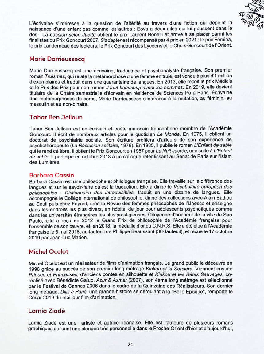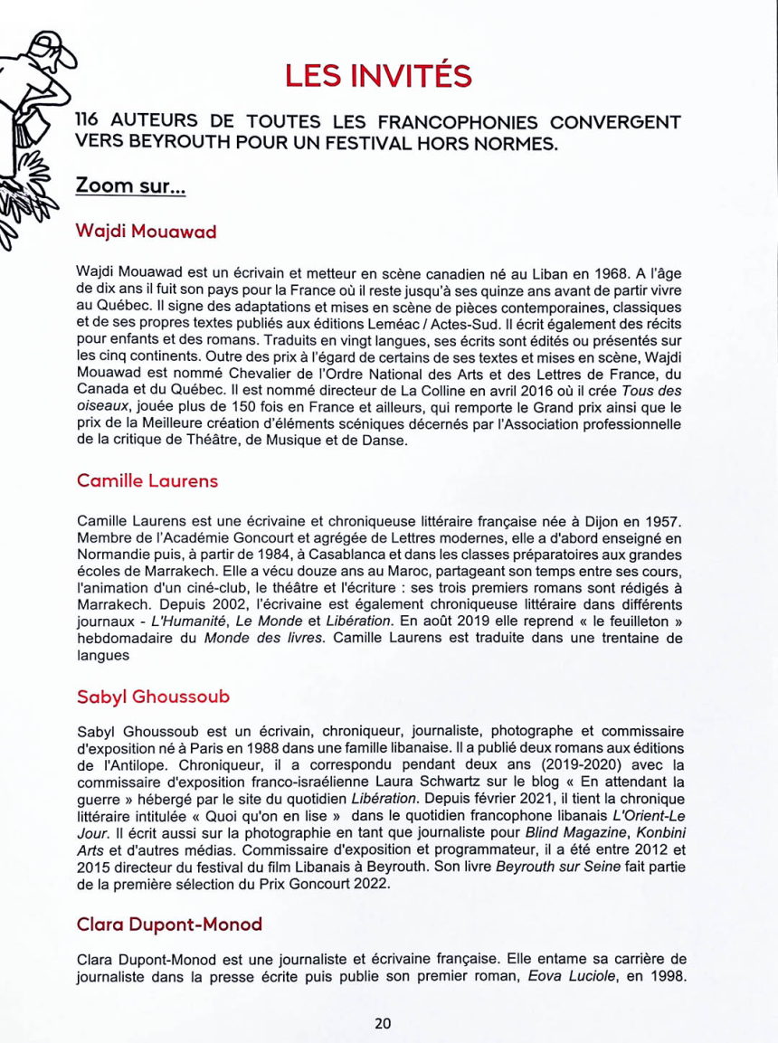 Plus de 110 auteurs et autrices phares de la littérature francophone du monde entier seront au rendez-vous. Les membres de l’Académie Goncourt (Eric-Emmanuel Schmitt, Camille Laurens, Didier Decoin, Tahar Ben Jelloun) seront rejoints par Fawzia Zouari, Fabien Toulmé, Marie Darrieussecq, Clara Dupont-Monod, Serge Bloch ou encore Ryoko Sekiguchi. Ils échangeront avec de nombreux auteurs libanais tels que Charif Majdalani, Diane Mazloum, Sabyl Ghoussoub et Hyam Yared et s’associeront à des réalisateurs, musiciens, philosophes et dessinateurs de renom pour faire de ce festival un événement riche et innovant où la littérature sous toutes ses formes dialogue avec les autres arts.