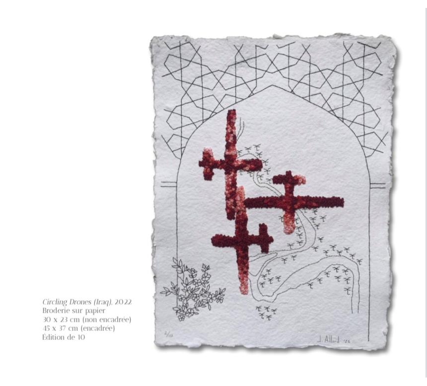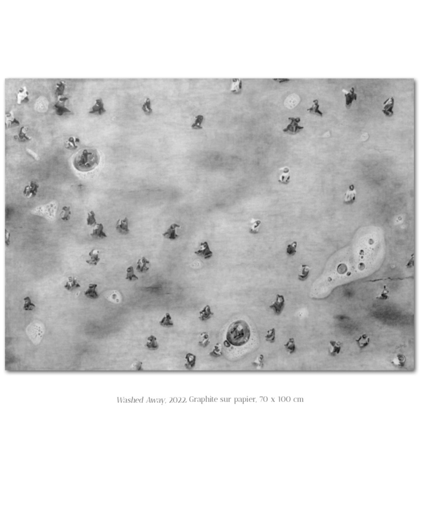La matière est également vulnérable au changement. À l’échelle micro, Dalia Baassiri dessine des bulles de savon éphémères comme métaphore de la fragilité de la situation au Liban. À l’échelle urbaine, Lilia Benbelaïd montre des paysages urbains que l’on croyait indestructibles et qui sont aujourd’hui dévorés par les conflits et les catastrophes, et Johanne Allard pointe du doigt le mouvement néfaste des drones contrôlés par une main invisible.»
