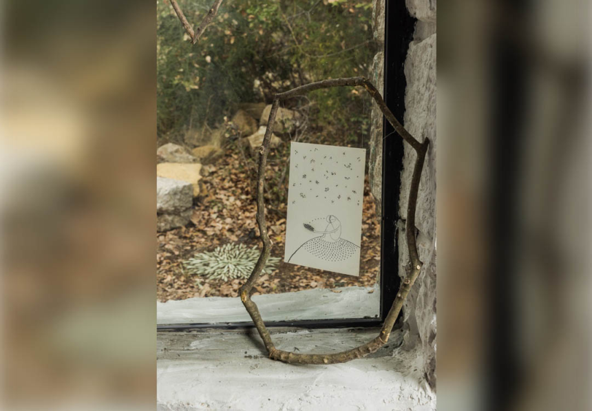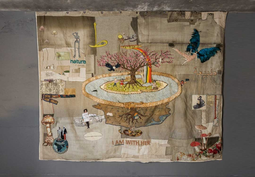 L’artiste plasticien Nathaniel Rackowe s’est inspiré de deux dessins non exécutés encore de Gaïa Fodoulian pour produire l’œuvre sculpturale et abstraite Drop by Drop. Elle a été en partie influencée par les esquisses préparatoires de Fodoulian pour une œuvre inspirée par les stalagmites de la grotte de Jeita, au Liban. Les lignes fracturées des poutres en acier inoxydable, qui font écho aux ruines et aux structures désintégrées de Deir el-Kalaa, sont ponctuées de gouttes de lumière qui laissent entrevoir un avenir plein d’espoir. L’artiste textile Adrian Pepe a collaboré avec Bisat al-Rih, un groupe de femmes artisanes libanaises qui travaillent la laine et utilisent des techniques traditionnelles de tissage pour créer des tapis et des tapisseries. Grâce à un processus de filage, de broderie à la main et de feutrage, la laine est transformée en œuvres d’art chargées d’émotion, de mythologie et de symbolisme. Pepe présente une carte du ciel brodée – inspirée par la façon dont les bergers se fiaient aux étoiles pour se guider – dans un espace aménagé. Ce macrocosme en laine, qui s’étend du sol au plafond, fait référence au feutre, le textile d’origine, et à son lien avec les anciennes traditions nomades. En ces temps incertains, les œuvres de Pepe évoquent une compréhension dormante et plus tangible de la nature et d’une forme d’existence primitive et ancrée. L’artiste Christine Safatly présente des dessins et des assemblages multimédias – comprenant, entre autres, du fusain, de la peinture à l’huile, du sucre, du latex, du fil de fer, du tissu et du carton – qui explorent la corporalité sexuée, les formes d’aliénation et les luttes socio-économiques collectives, inspirés par ses expériences de vie en tant que femme au Liban.