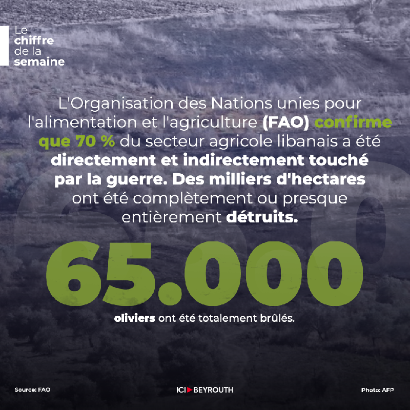 L'Organisation des Nations unies pour l'alimentation et l'agriculture (FAO) confirme que 70% du secteur agricole libanais a été touché, tant directement qu'indirectement. Des milliers d'hectares ont été complètement ou presque totalement détruits et 65.000 oliviers ont entièrement brûlé en raison de bombardements au phosphore blanc, interdit au niveau international, et à la bombe à fragmentation. Cette situation requiert impérativement du gouvernement et du ministère de l'Agriculture des efforts considérables pour déminer et nettoyer ces vastes champs. En effet, tant qu’il reste des bombes à fragmentation, les agriculteurs ne peuvent pas accéder à ces terres, car leur sécurité serait menacée.