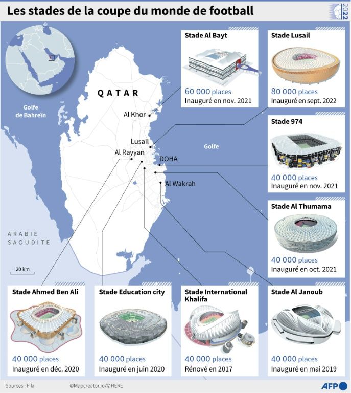 Huit stades accueilleront la Coupe du monde de football, qui se déroulera du 20 novembre au 18 décembre au Qatar. Une seule enceinte existait avant la désignation du pays comme hôte du Mondial.