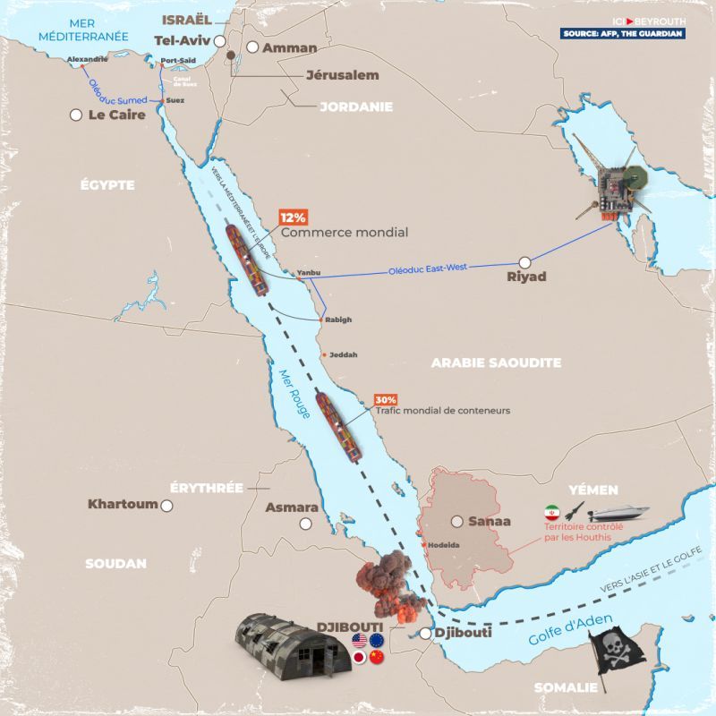 La mer Rouge dispose de deux points d’accès. Au sud, se trouve le canal de Bab el-Mandeb, situé au large des côtes yéménites et qui rejoint la mer d’Arabie et l’océan Indien. Au nord, le canal de Suez donne sur la Méditerranée. Cette zone est particulièrement stratégique car elle accueille en temps normal entre 12% et 15% du commerce mondial et 30% du trafic de porte-conteneurs, soit plus de 20 000 navires chaque année.