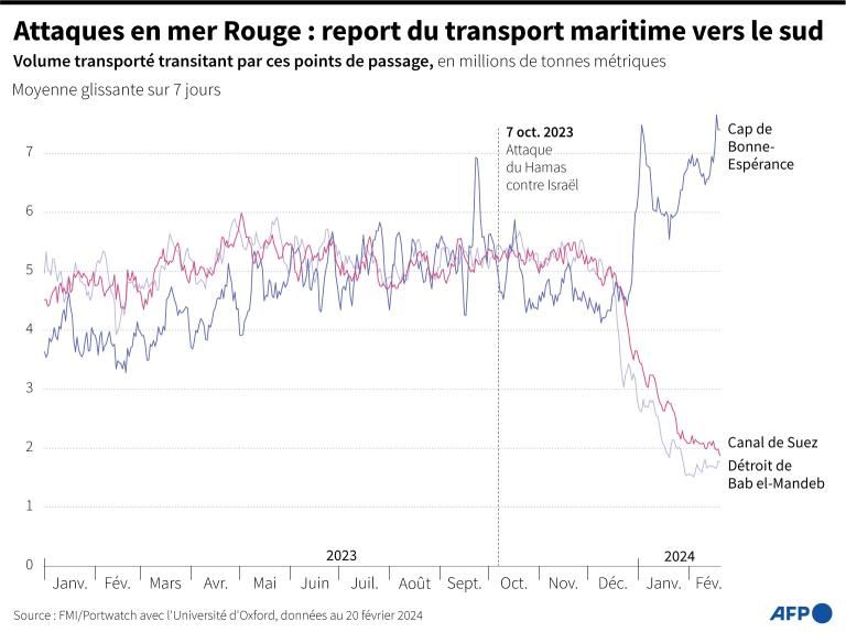 De nombreuses compagnies de transport maritimes comme la CMA CGM et Maersk ont préféré changer de route maritime en passant par le cap de Bonne-Espérance (au sud de l’Afrique) au lieu du canal de Suez afin d’assurer la sécurité de leurs navires. Selon un rapport de la Conférence des Nations unies sur le commerce et le développement (Cnuced), le trafic maritime du cap de Bonne-Espérance a augmenté de 89% mi-2024.