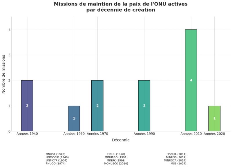 La première mission de ce type, l'Organisation des nations unies pour la surveillance de la trêve (Onust), a été déployée en 1948 pour surveiller l'armistice entre Israël et ses voisins arabes. Cette mission existe encore aujourd'hui, témoignant de la longévité potentielle de ces opérations.