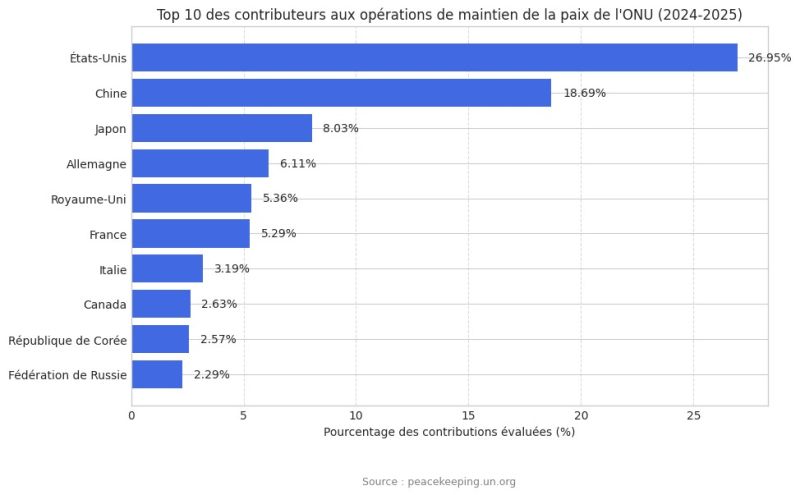 Quant au financement, les opérations sont principalement soutenues par les pays développés, avec les États-Unis, la Chine, le Japon, l'Allemagne, le Royaume-Uni et la France en tête des contributeurs.