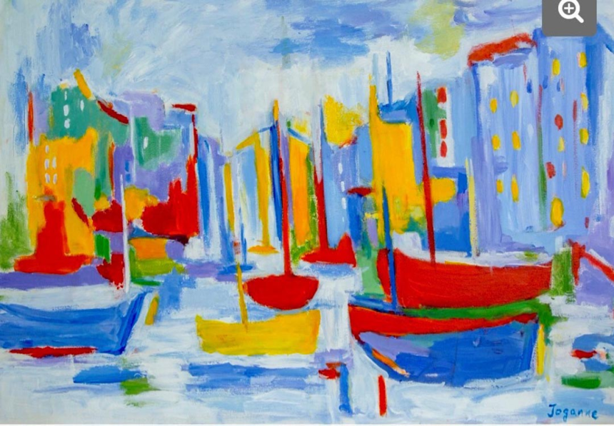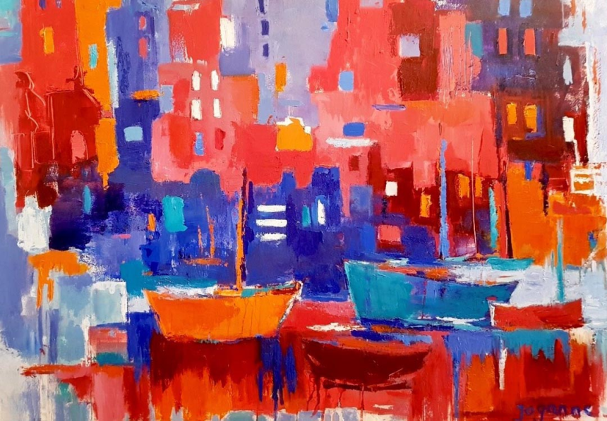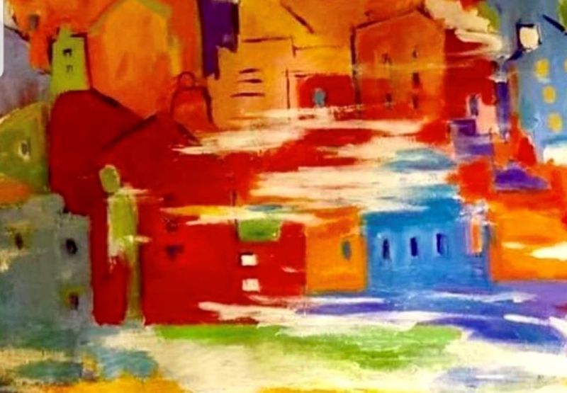 Voyage à travers la toile, évasion vers un univers fantasmé... Espace fantaisie ouvert à tous les possibles d’un ailleurs sublimé par l’artiste dans une euphorie de couleurs… Paradis sur mesure, réinventé. Ville auréolée de lumière, chaude et accueillante comme une matrice bienfaisante.