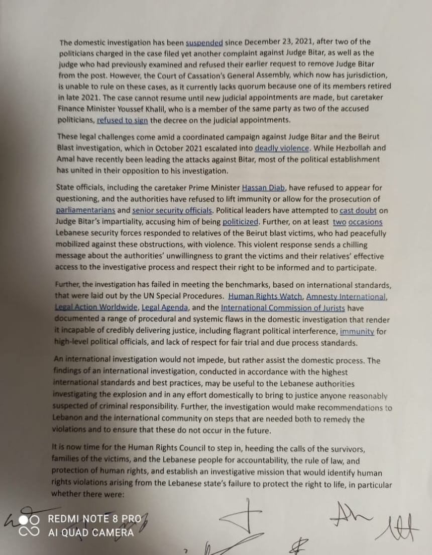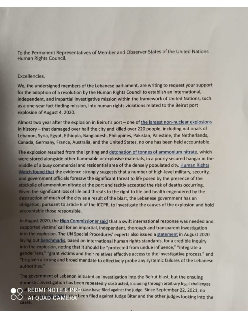 Cette lettre expose les phases de l’enquête menée par le juge d’instruction Tarek Bitar et les tentatives de plusieurs parties de la bloquer. Elle appelle le Conseil à établir une commission d’enquête internationale sous l’égide de l’ON.