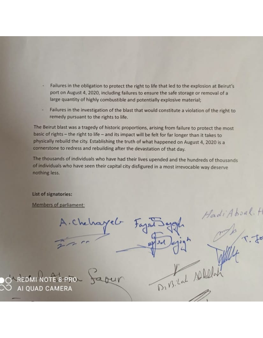 Le chef du bloc parlementaire de la Rencontre démocratique (Parti socialiste progressiste) Teymour Joumblatt, ainsi que les autres membres du bloc, ont signé une lettre adressée par les parents des victimes de l’explosion du 4 août 2020 au port de Beyrouth, au Conseil des droits de l’homme des Nations-Unies.